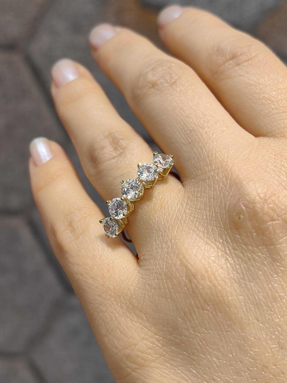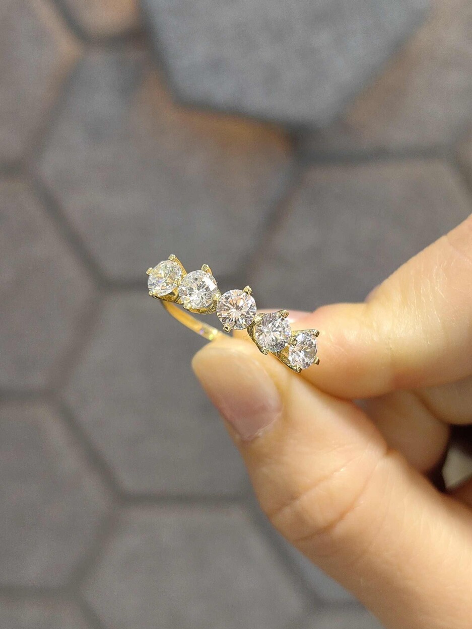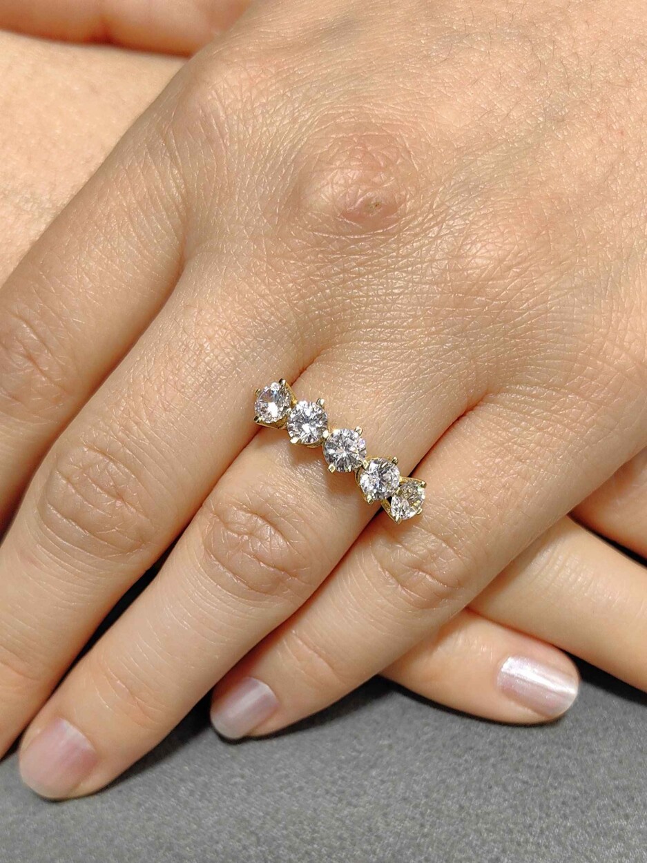 Zarafetin ve ihtişamın mükemmel birleşimi olan bu beştaş yüzük, altının sıcak ışıltısını en şık haliyle yansıtıyor. Kusursuz kesime sahip beş taşın ışığı her açıdan büyüleyici bir şekilde yansıtması, bu özel tasarımı göz alıcı bir hale getiriyor.