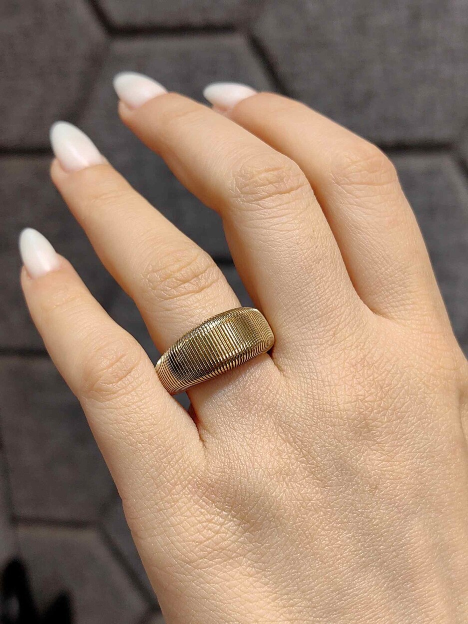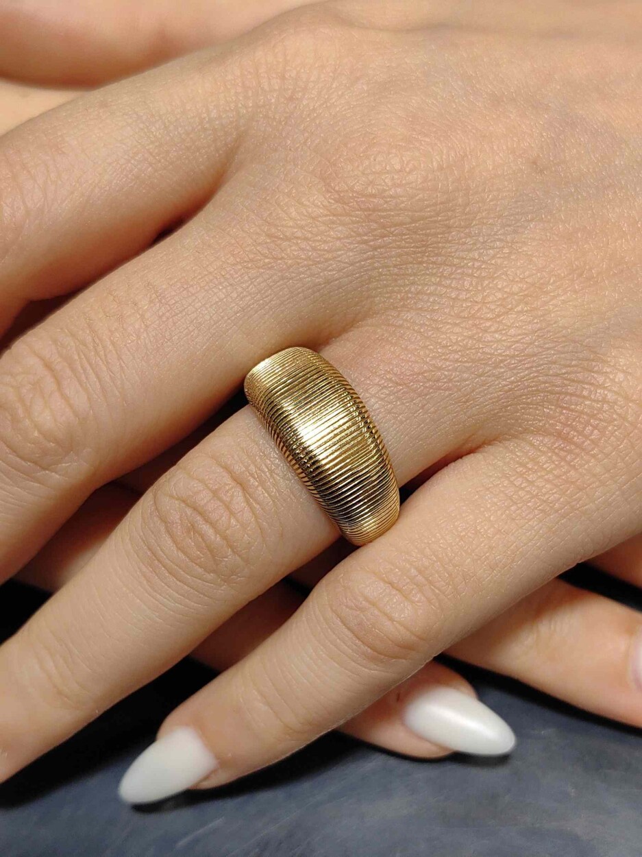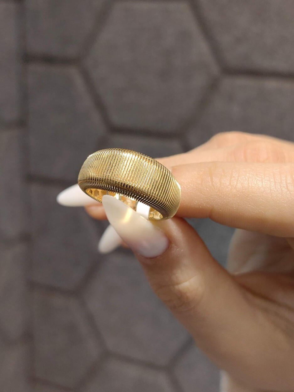 14 Ayar Özel Tasarım Çizgili Taşsız Fantazi Yüzük, 5.03 gram ağırlığında ve 14 ayar 585 milyem sarı altından üretilmiştir. Standart ölçülerde tasarlanan bu zarif yüzük, kadınlar için günlük kullanım, söz, nişan ve düğün gibi özel günlerde şıklığına şıklık katıyor.