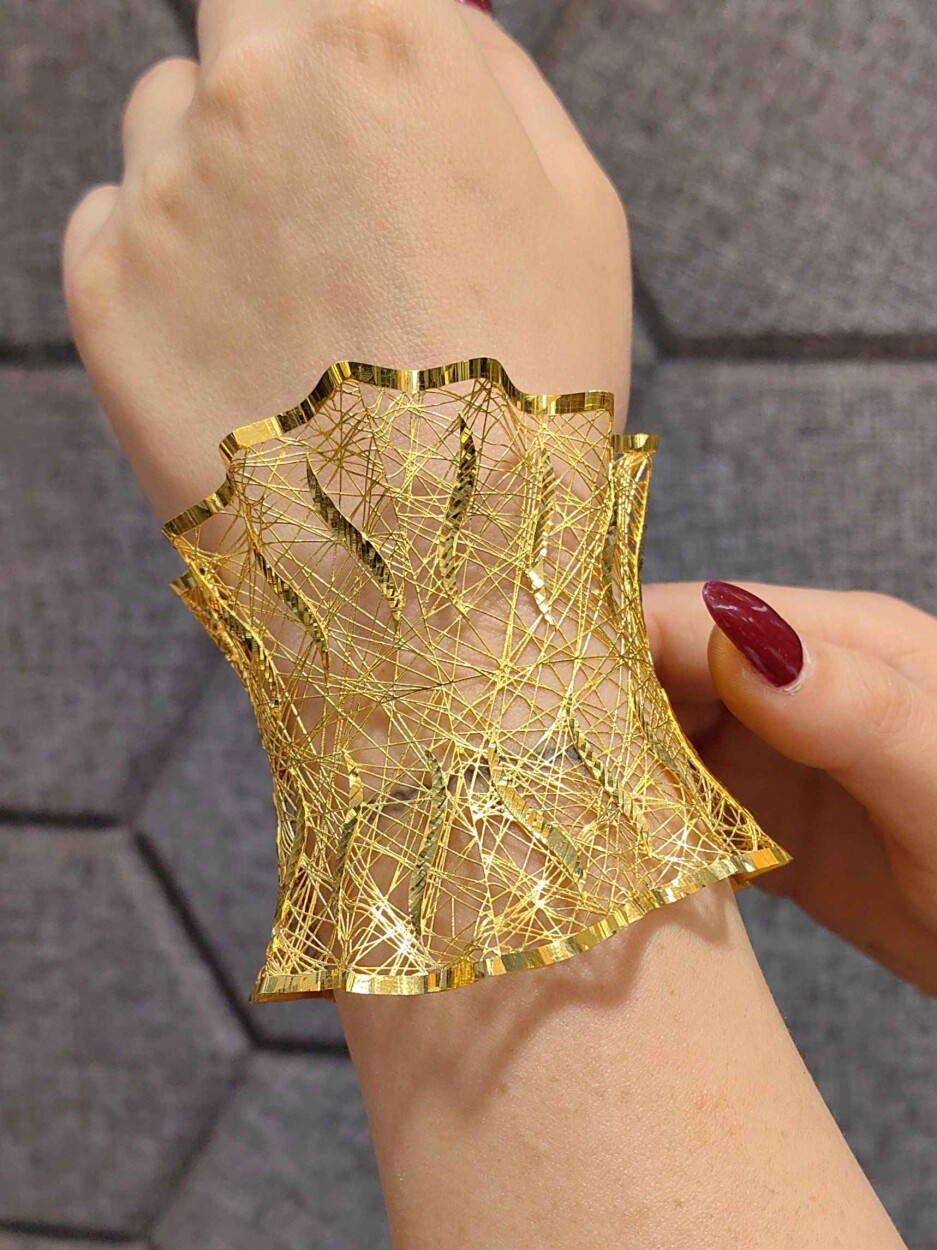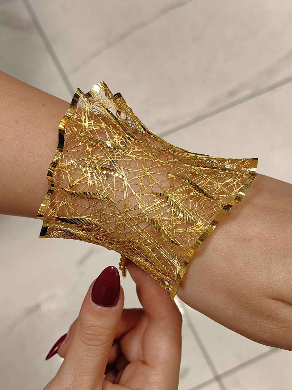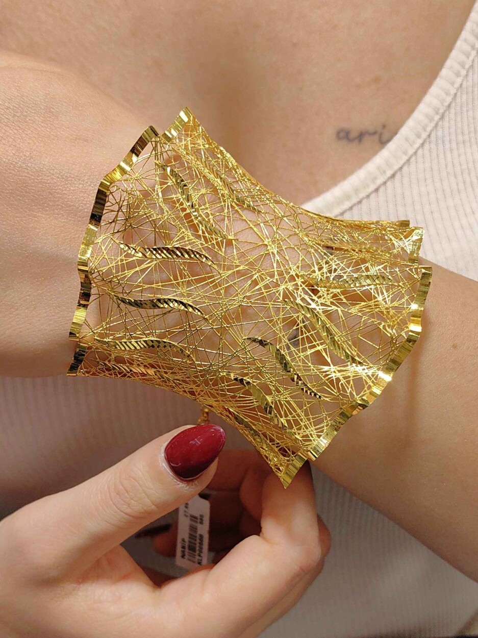 Sonsuz zarafetin simgesi, 14 ayar 585 milyem altından işlenmiş bu tül model altın kelepçe, bileğinizde parıldayan bir sanat eseri. 27.89 gramlık etkileyici ağırlığı ve parlak sarı tonuyla, her bakışta göz kamaştıran bir şıklık sunuyor. Türkiye'nin usta kuyumcuları tarafından 2025 yılında özenle tasarlanıp üretilen bu kelepçe, zarafetinizi bir adım öteye taşıyor.