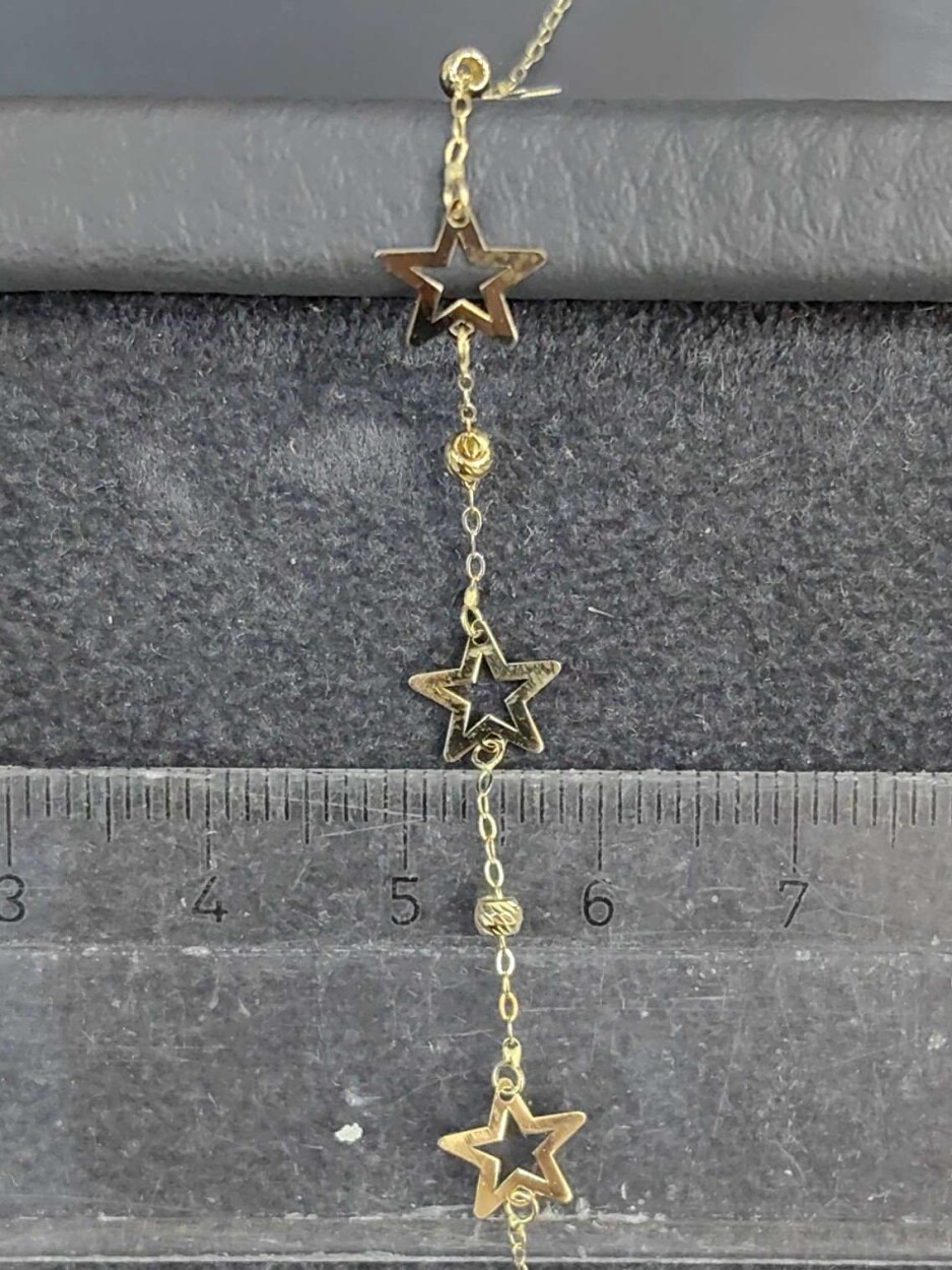 14 Ayar Yıldız Detaylı Dorika Toplu Zarif Bileklik KNY01683, 14 ayar (585 milyem) sarı altından üretilmiş ve 1,01 gram ağırlığıyla zarif bir tasarıma sahiptir. Standart ölçüleri sayesinde her bileğe rahatça uyum sağlar. Bu bileklik, günlük kullanımda zarif bir şıklık sunarken, düğün, nişan, söz ve davet gibi özel günlerde de zarafetinizi öne çıkaracak mükemmel bir aksesuardır. 2024 yılında Türkiye'de yerli üretim olarak tasarlanmış bu ürün, kaliteli işçiliği ve yıldız detaylarıyla dikkat çeker.