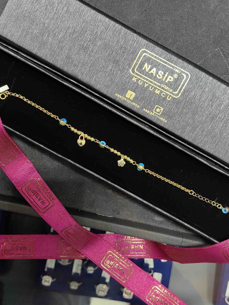 8 ayar sarı altından üretilen bu zarif bileklik, 3,51 gram ağırlığında olup, dorika tasarımı ve nazar boncuğu ile figür detaylarıyla şıklığı tamamlar. Standart ölçüde üretilen bu bileklik, günlük kullanımda olduğu gibi düğün, nişan, söz ve davet gibi özel günlerde de şıklığınızı ön plana çıkaracaktır.