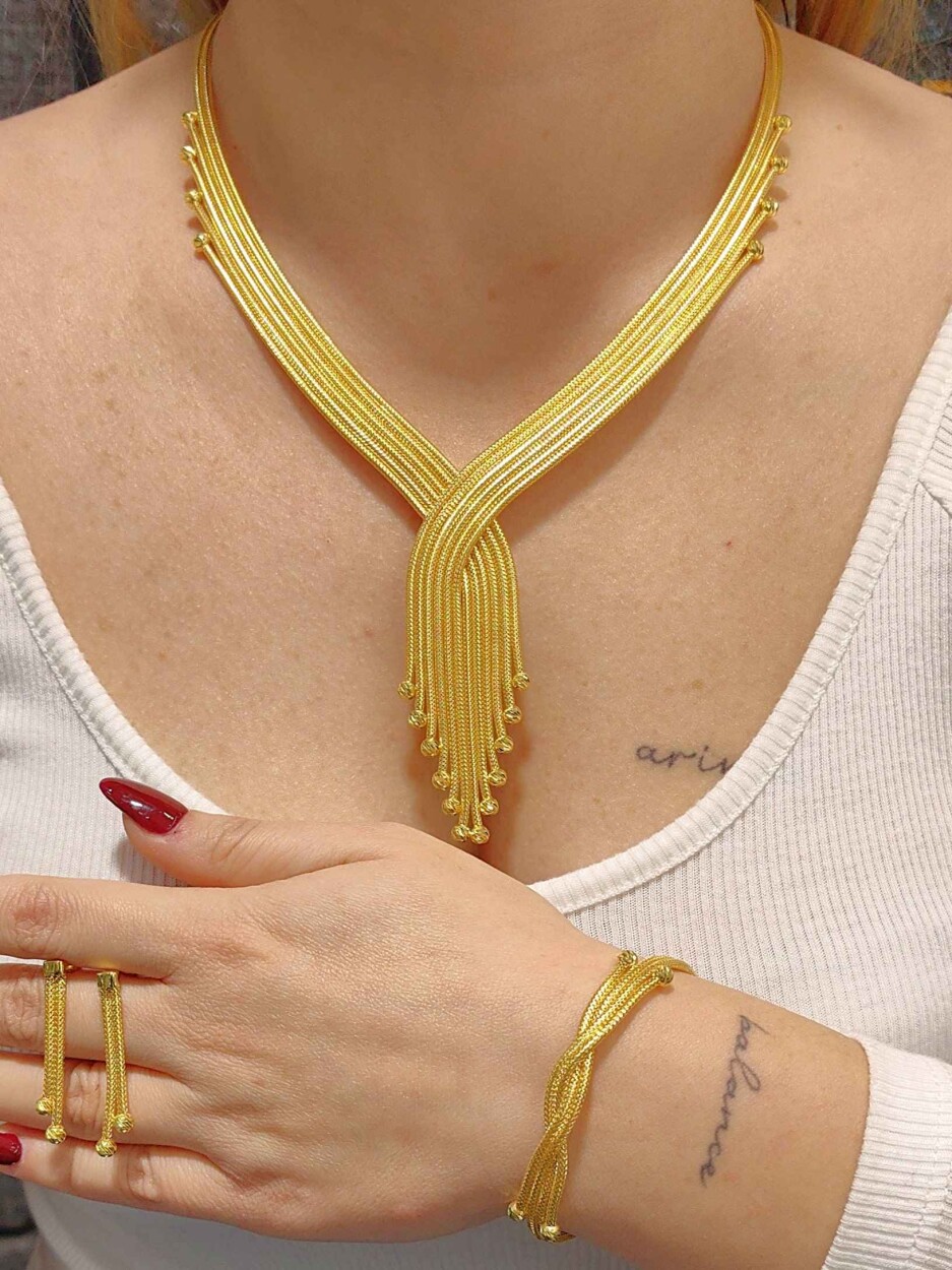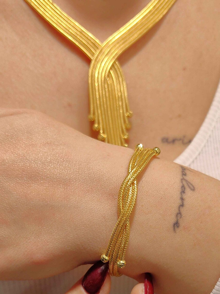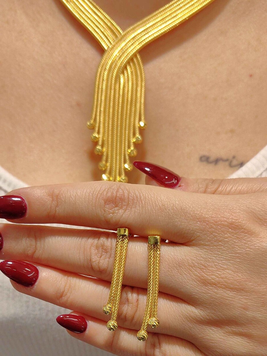 2025’in zarif şıklığı burada! 8 Ayar Tül Kalze Set Takımı, sarı altının sıcak ve asil tonuyla her anınıza ışıltı katacak. Toplam 15.70 gr ağırlığındaki bu set, kolye (11.20 gr), bileklik (3.01 gr) ve küpe (1.49 gr) ile her detayıyla mükemmel bir uyum içinde.