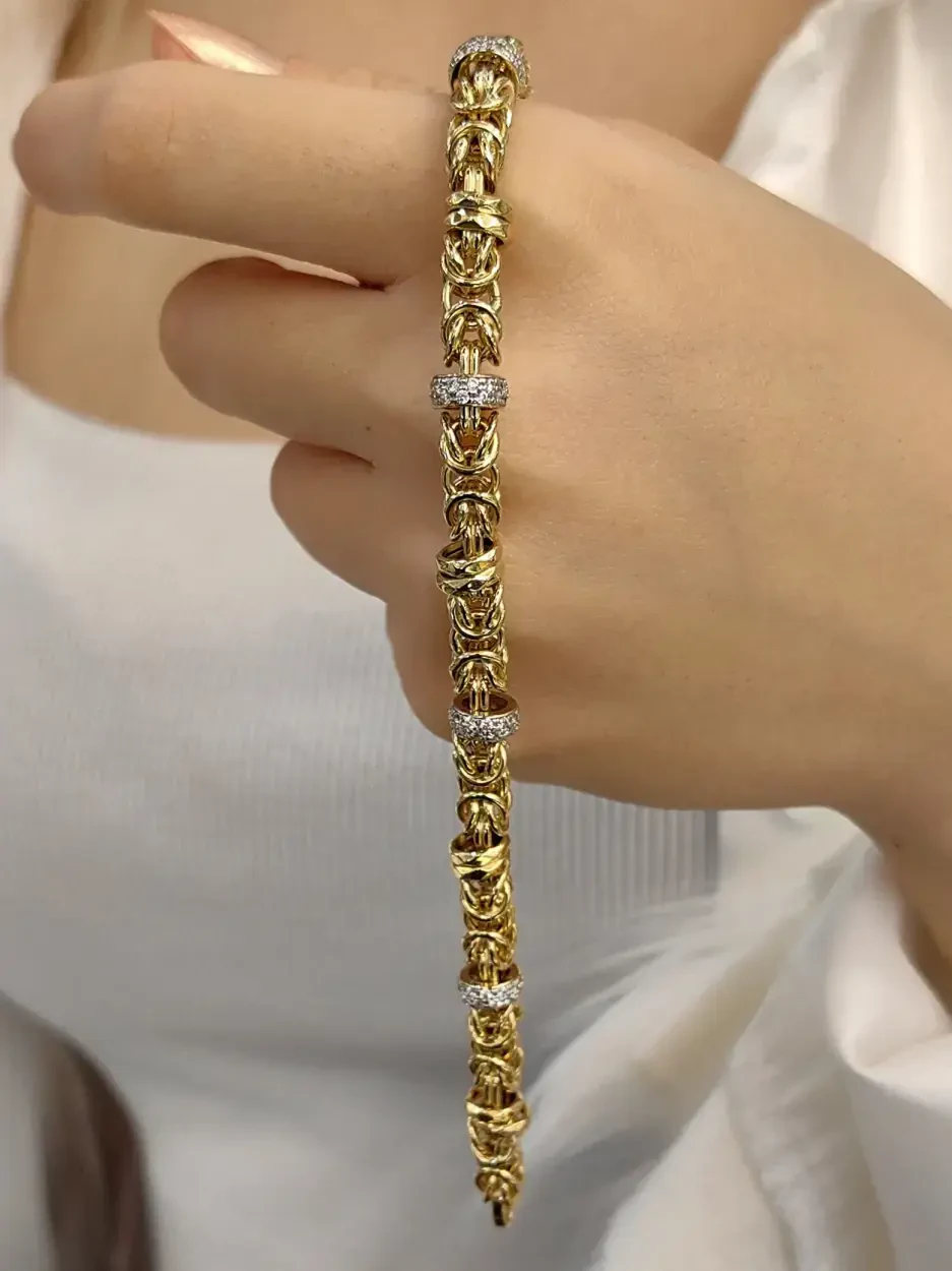 Tarz Altın Bileklik KNY00697, 14 ayar (585 milyem) sarı altından üretilmiş ve 12,81 gram ağırlığıyla şık ve dayanıklı bir tasarıma sahiptir. Standart ölçüleri sayesinde her bileğe rahatça uyum sağlar. Bu bileklik, günlük kullanımda zarif bir şıklık sunarken, düğün, nişan, söz ve davet gibi özel günlerde de zarafetinizi ön plana çıkaracak mükemmel bir aksesuardır. 2024 yılında Türkiye’de yerli üretim olarak tasarlanmış bu ürün, kaliteli işçiliği ve estetik detaylarıyla dikkat çeker.