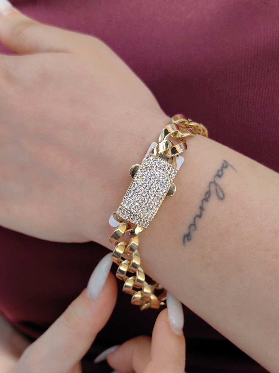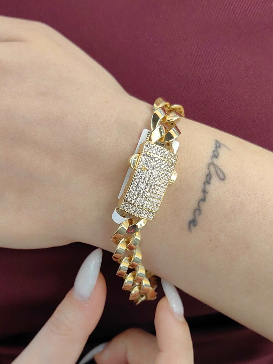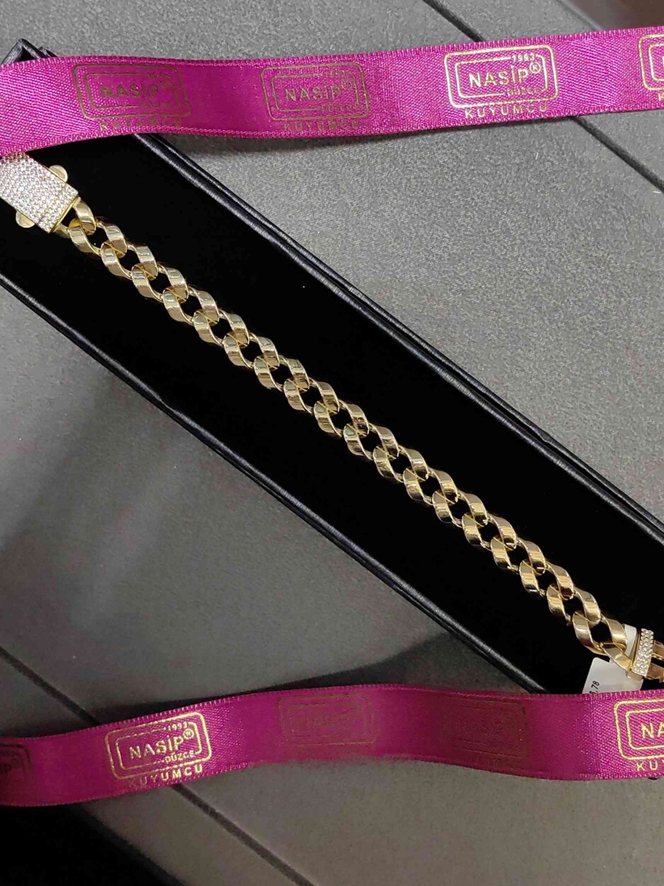 Gurmet zincir formunun güçlü ve estetik yapısı, taşlı detaylarla buluşarak bu bilekliği hem günlük şıklıkta hem de düğün, nişan, söz ve davet gibi özel anlarda vazgeçilmez bir stil tamamlayıcısı haline getirir. Standart ölçüsüyle bileğe mükemmel bir uyum sağlarken, her hareketinizde ışığı yansıtarak göz kamaştırır.