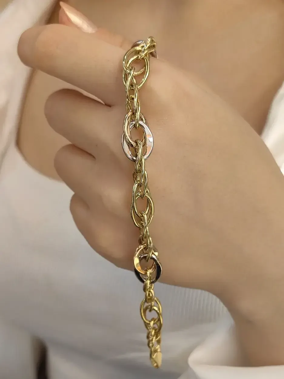 Zincir Altın Bileklik KNY00072, 14 ayar (585 milyem) sarı altından üretilmiş olup, 8,48 gram ağırlığa sahiptir. Standart ölçüleriyle rahatça takılabilen bu bileklik, günlük kullanım için ideal olmakla birlikte düğün, nişan, söz ve davet gibi özel günlerde de şıklığınızı tamamlar.